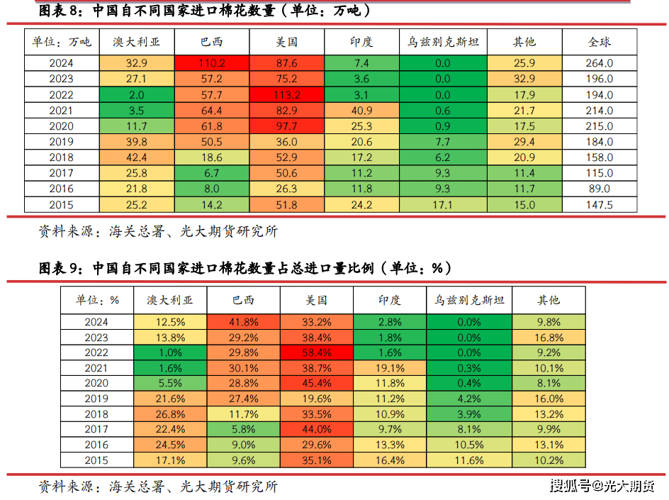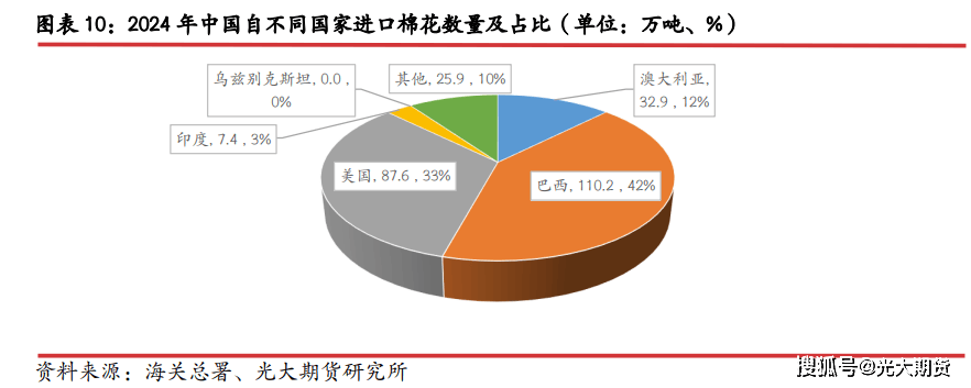 中国进口巴西棉数量持续添加,进口美棉数量逐步下降。近年来我国棉花进口款式有较大变化,2019 年之前,我国棉花进口来历相对分离,其时美国是我国第一大棉花进口来历国,占比约 30-45%,是第二大棉花进口来历国,占比约四分之一,自巴西、印度、乌兹别克斯坦也有大量棉花进口,占比约 10%摆布。自美国进口棉花数量占比正在 2020 年达到创记实的58。4%之后便逐步下降,2020 年降至三分之一,2025 年 1-2 月数据来看,降至 20%摆布。自棉花进口正在 2020-2022 年间有较为较着下降,2023 年起头逐步恢复。自巴西进口棉花数量逐步添加,2024 年巴西成为我国最次要的棉花进口来历国。自印度棉花进口量从 2022 年起有较着下降,目前曾经降至不脚 3%,自乌兹别克斯坦进口棉花数量自 2017 年起有较着下降,目前进口曾经根基不从乌兹别克斯坦进口棉花。当前我国棉花进口以巴西棉为从,澳棉进口量占比也正在逐步添加,美棉进口数量估计将进一步下降。