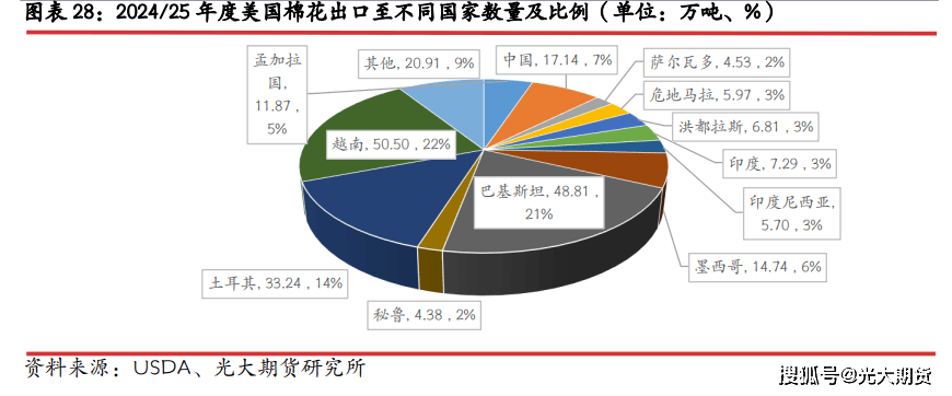 :中国和越南是最次要的棉花出口国,2024 年棉花出口中国占比约 28%,出口越南数量占比约 26%,出口印度数量占比约 12%,出口印度尼西亚、孟加拉数量占比各占 10%摆布。