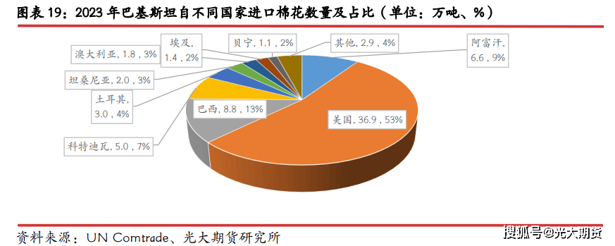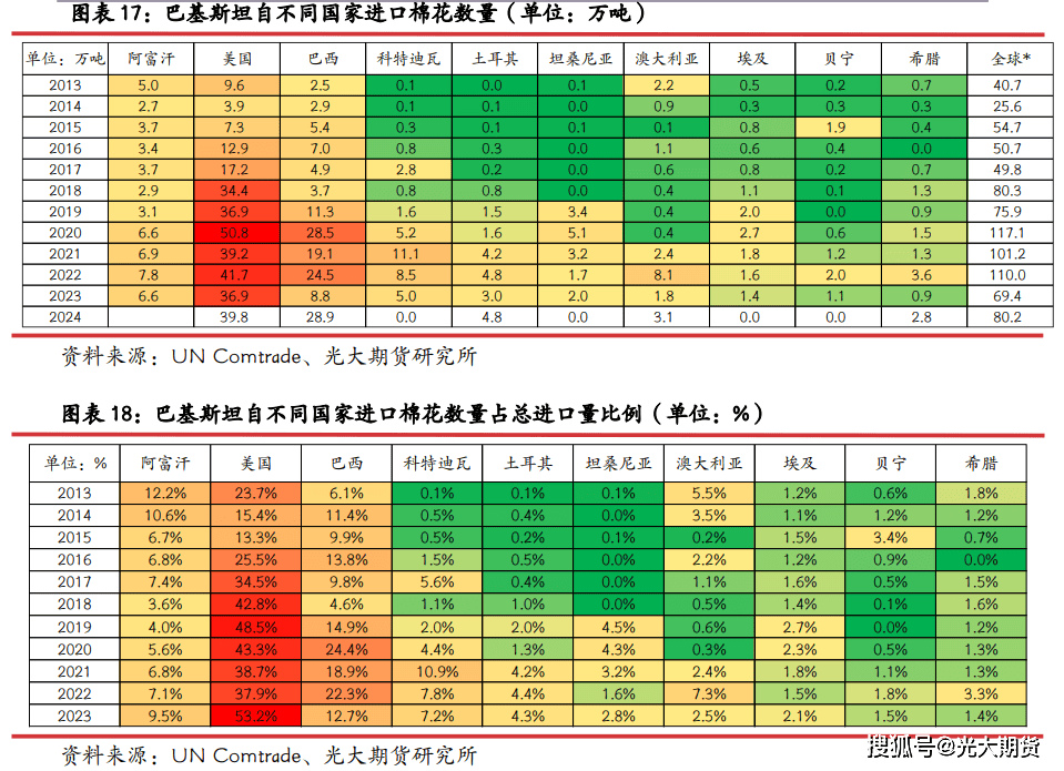 美国是巴基斯坦最次要的棉花进口来历国,其余棉花进口次要来自于巴西、阿富汗、西非等次要棉花出口地或有地缘劣势的地域。自 2018 年以来,巴基斯坦棉花进口量有较着添加,增幅次要就是来自于美棉进口,该年巴基斯坦进口美棉 34。4 万吨,同比增幅翻倍,占总进口量比例超 40%。2024 年巴基斯坦进口美棉估计约 40 万吨,占棉花总进口比例超 50%。巴西是巴基斯坦第二大棉花进口来历国,但近 10 年来自巴西进口占比波动较大,最高近 25%,最低不脚 5%,2024 年自巴西进口棉花数量同比有较着添加,估计约 29 万吨,占比或超 30%,创下汗青新高。因为巴基斯坦取阿富汗邻接,因而虽然阿富汗不是次要产棉国及棉花出口国,但阿富汗每年仍是有 6-8 万吨棉花出口至巴基斯坦,占巴基斯坦棉花年进口量的 5-10%。此外,科特迪瓦、贝宁等西非地域以及坦桑尼亚等东非地域也是巴基斯坦棉花次要进口来历地,合计占比超 10%。