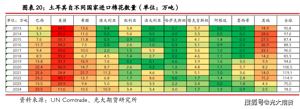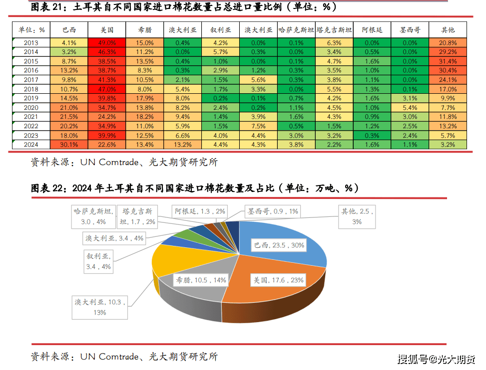 土耳其次要从巴西和美国进口棉花,自希腊和也有较大数量棉花进口,近年来自美国进口占比逐步下降,自巴西进口占比逐步添加,2024 年进口澳棉数量也有较着增量。土耳其棉花年进口量大约正在 75-120 万吨之间,2023 年之前,美都城是土耳其最大的棉花进口来历国,年进口美棉数量根基不变正在 35-45 万吨之间,占土耳其年棉花进口量 35-50%。2024 年巴西跨越美国成为土耳其最大的棉花进口来历国,2024 年土耳其进口巴西棉 23。5 万吨,占总进口量比例30%,自美国进口 17。6 万吨,占比 22。6%,自美国进口棉花数量及占比均创下近 10 年来新低。希腊也是土耳其较为次要的棉花进口来历国,二国连接,运输相对便当,一般环境下,土耳其每年要从希腊进口超 10 万吨棉花,占土耳其棉花年进口量约 10%。2024 年进口澳棉数量大幅增加,为 10。3 万吨,占总进口量比例初次跨越 10%。2024 年土耳其进口美棉数量下降,自其余次要进口国进口量响应添加。