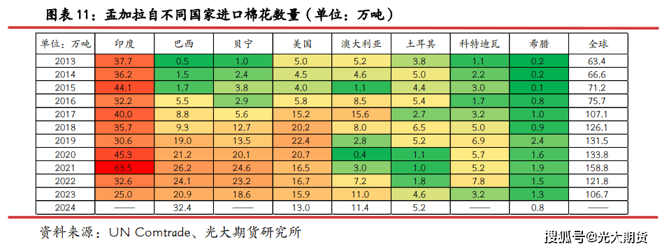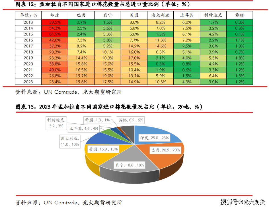 孟加拉棉花进口相对分离,印度是其最次要棉花进口来历国,其余次要来自西非、巴西、美国、。取其余次要棉花进口国环境稍有分歧,孟加拉从印度进口棉花较多,运输较为便利是次要缘由之一。过往十年中,印度一曲是孟加拉最次要的棉花进口来历国,2013-2015 年孟加拉自印度进口棉花占其总进口量的一半以上,后续跟着印度棉花出口总量下降,孟加拉自印度进口棉花数量也逐步下降,2023 年孟加拉从印度进口棉花 25 万吨,占总进口量比例 23。4%。除印度外,西非就是其最次要的棉花进口来历地,近年来孟加拉自贝宁进口棉花占总进口比例近 20%,自科特迪瓦进口占比也有 3-6%摆布。单国别来看,巴西是孟加拉第二大棉花进口来历国,2022-2023 年均不变正在 20%摆布。自美国进口棉花占总进口量比例正在 15%上下波动,自进口棉花比例波动较大,2023-2024 年不变正在 11 万吨摆布,占总进口量比例约 10%。