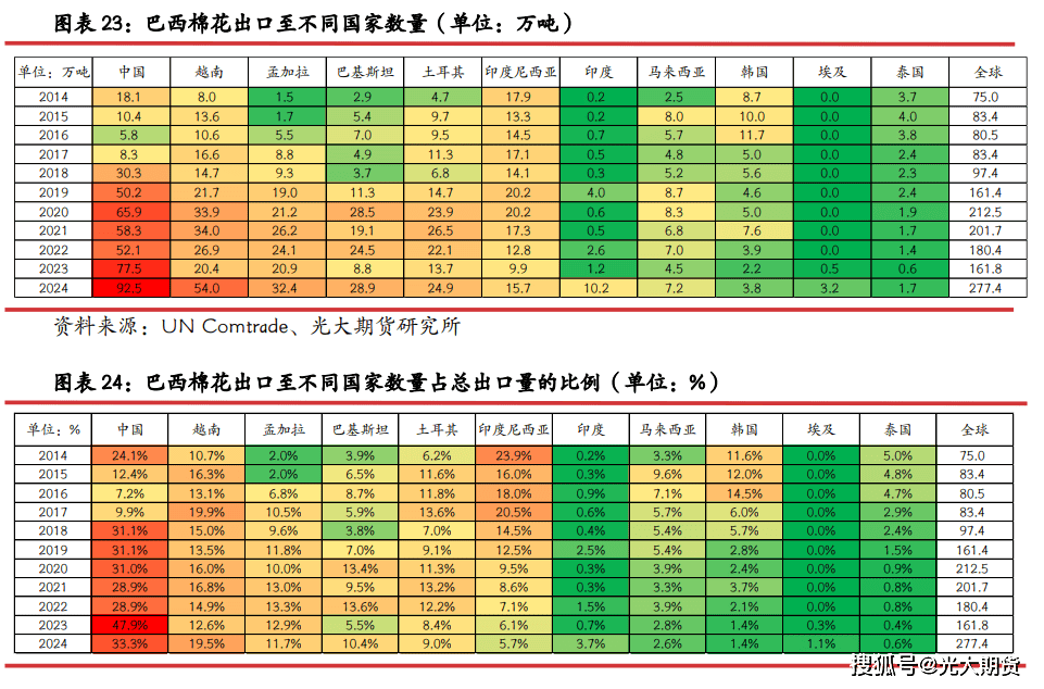 中国是巴西棉花最次要的出口地,2024 年巴西棉出口至越南比例也有较着添加,占比约20%,出口至孟加拉、巴基斯坦、土耳其比例均正在 10%摆布。巴西棉出口至中国数量还正在逐年添加,2024 年巴西棉出口至中国数量超 90 万吨,但因为 2024 年巴西棉出口总量也有较大幅度添加,因而 2024 年巴西棉出口至中国数量占比同比还有必然幅度下降,由 47。9%降至 33。3%,出口至中国比例仍远超其他国度。2018 年之前印度尼西亚是巴西第二大棉花出口地,年出口量占比约 20%,近年来回落至 6%摆布。2018 年之后,越南是巴西第二大棉花出口地,2024 年巴西出口越南棉花数量 54 万吨,占总出口量比例 19。5%。近年来巴西棉出口至孟加拉数量还正在逐步添加,可是出口占比有小幅下降,2024 年巴西出口孟加拉棉花数量超 30 万吨,占总出口量11。7%,是巴西棉花第三大出口地。出口巴基斯坦占比波动较大,近年来正在 5-14%之间波动,2024 年数据为 10。4%。出口土耳其棉花数量占比逐步下降,2024 年虽有小幅反弹,但也不脚10%。2024 年仅中国、越南、孟加拉、巴基斯坦、土耳其、印度尼西亚六国就占巴西棉总出口量的九成。