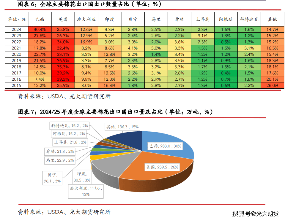 巴西、美国是全球最大的两个棉花出口国,2024/25 年度数据,巴西+美国棉花出口量占全球棉花总出口量比例跨越 55%。