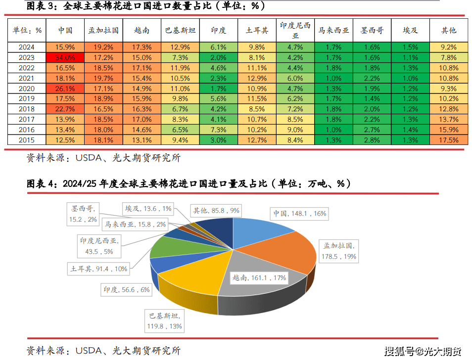 中国、孟加拉、越南是全球前三大棉花进口国,此中孟加拉棉花进口数量最为不变,近 10年来孟加拉棉花进口占全球棉花总进口量的比例不变正在 16-20%之间,年进口量根基正在 150-185万吨。正在 2024/25 年度孟加拉棉花进口量添加、中国棉花进口量下降的环境下,孟加拉再度反超中国成为全球第一大棉花进口国。