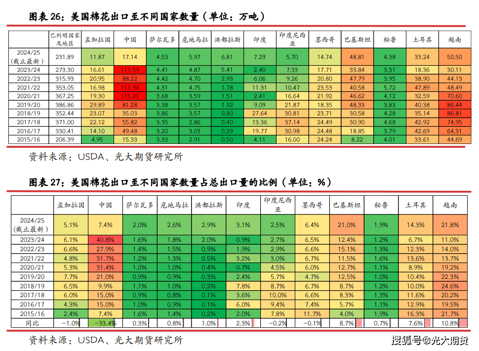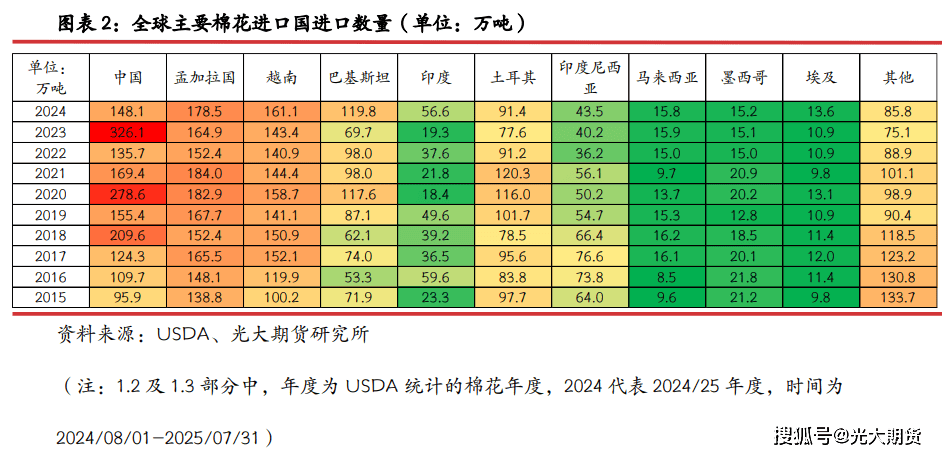 (注:3。2 部门中,数据来历 USDA,年度为棉花年度,2024/25 暗示 2024/08/01-2025/07/31,统计口径为已列明国度及地域陆地棉当前市场年度累计出口量为当前市场年度未拆船量之和)。