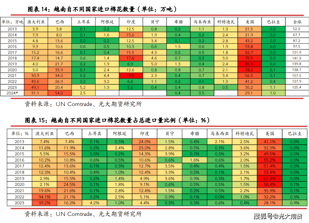 越南棉花进口次要来历于、美国及巴西,2022 年反超美国成为越南最大棉花进口来历国。越南棉花进口相对集中,次要来自巴西、、美国这全球前三大棉花出口国。2019-2020 年,越南自进口棉花数量有较着下降,2021 年大幅添加,年进口量超 30 万吨,2023 年自进口棉花数量近 50 万吨,占越南棉花进口总量约 4 成,但2024 年进口澳棉数量降至 31 万吨,占比约四分之一。越南自美国进口棉花数量逐步下降,2019年越南进口美棉数量达到巅峰,约 86 万吨,占总进口量超 6 成,但 2024 年自美国进口棉花数量曾经不脚 30 万吨,占比约四分之一。2024 年越南进口美棉及澳棉数量均有较着下降,进口巴西棉数量激增,2024 年越南进口巴西棉约 54 万吨,同比增幅超 160%,占全年总进口比例超45%。2021 年之前,越南每年还从印度进口 10 万吨以上的棉花,但 2021 年之后,越南自印度进口棉花数量降至 5-6 万吨,占总进口量比例降至 5%摆布。
