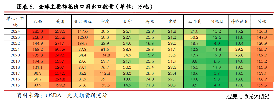 巴西:巴西曾经超越美国成为全球第一大棉花出口国,约三分之一出口至中国,五分之一出口至越南,出口至孟加拉、巴基斯坦、土耳其数量占比均正在 10%上下。