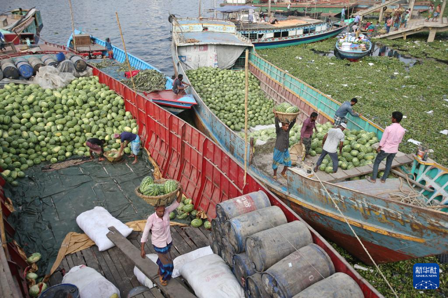 3月16日,正在孟加拉国达卡的萨达尔加特轮渡船埠,工人们正在船上搬运运往本地市场的西瓜。 近日,孟加拉国送来西瓜丰收季。