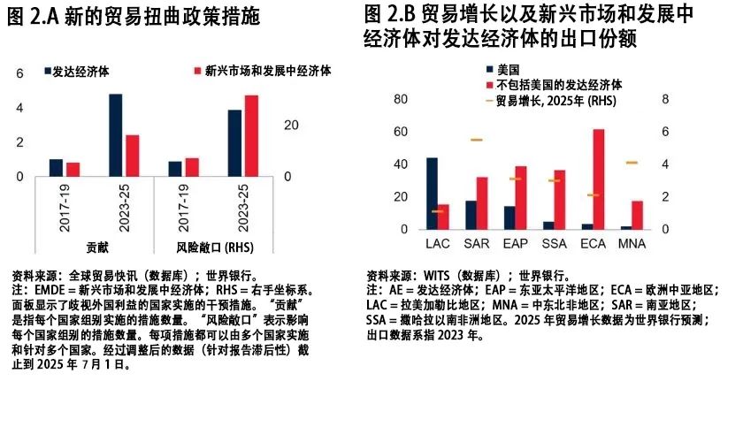 高频目标进一步了这种普遍的疲弱。例如,反映制制业健康情况的制制业采购司理人指数 (PMI) 显示,跨越三分之二的演讲国度呈现新出口订单收缩。现实上,指数显示新出口订单正在4月份暴跌至20个月来的低点,并正在5月份继续低迷。瞻望将来,若是政策严重场面地步呈现缓解,供应链逐步顺应新的关税升级,我们估计2026年全球商业增速可小幅回升至2。7%。虽然如斯,这一预测仍比我们 1 月份的预测低0。8个百分点。家组此外商业增加前景呈现显著差别,反映了对性办法和政策不确定性的程度分歧。发财经济体占2022年以来新出台商业办法的近70%,但其商业壁垒总体上仍低于成长中经济体。性办法添加对依赖这些市场的新兴市场和成长中经济体的影响尤为严沉(图2。A)。深度融入全球价值链或严沉依赖美国及其他发财市场的经济体(如欧元区、拉美加勒比地域以及欧洲中亚地域的新兴市场和成长中经济体)势必会呈现商业增加减速(图2。B)。